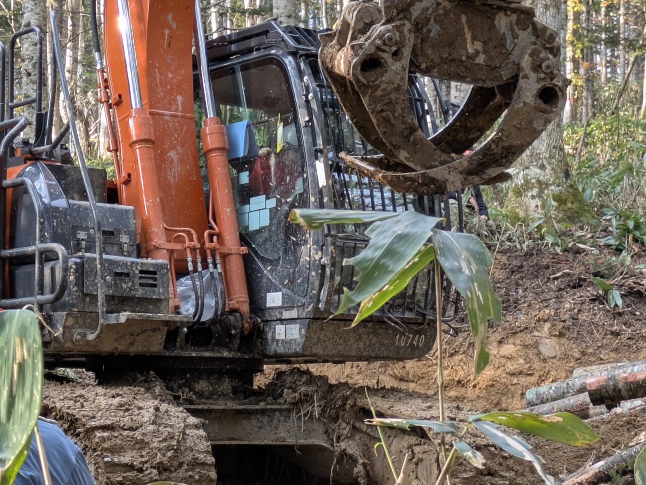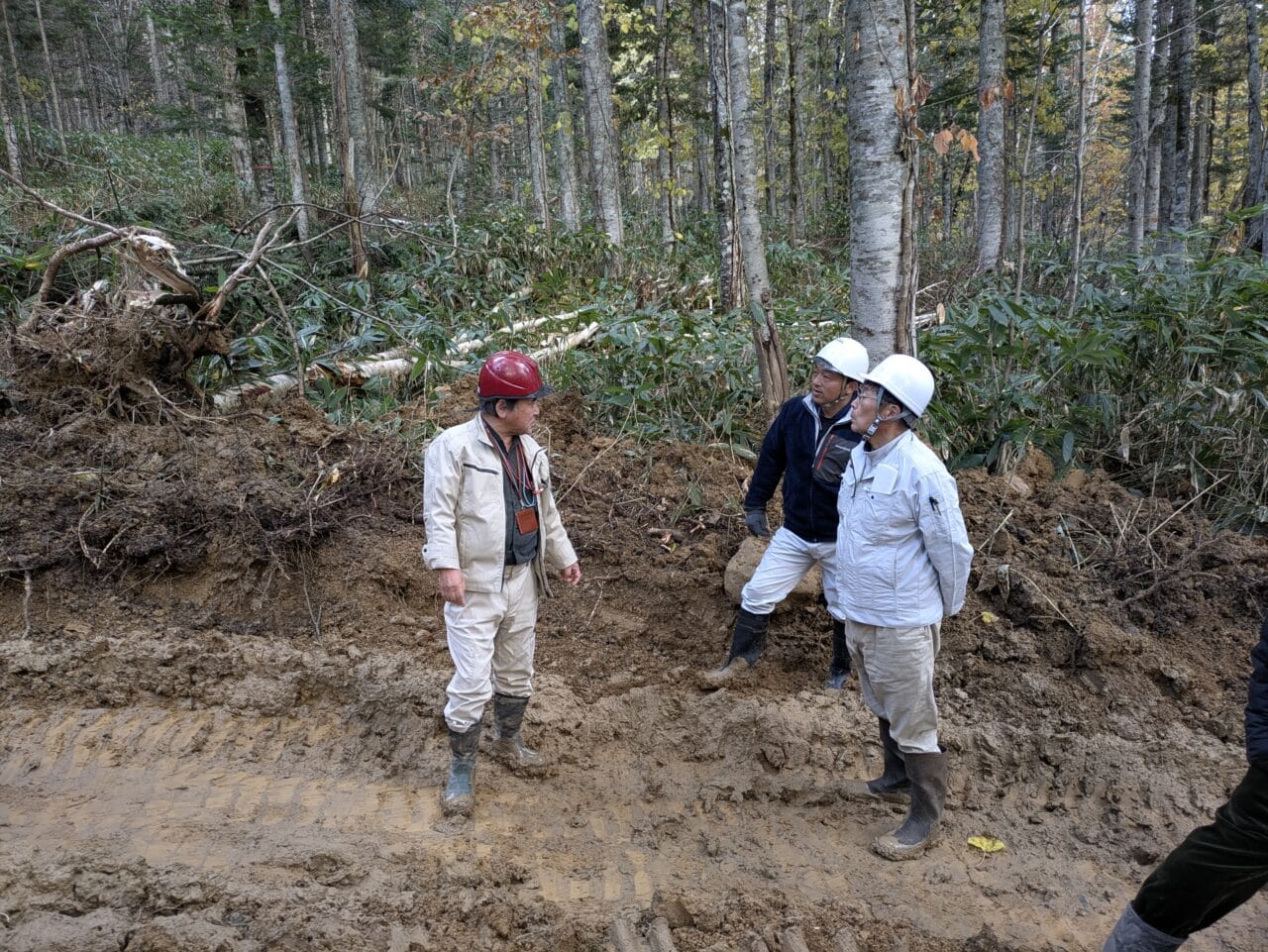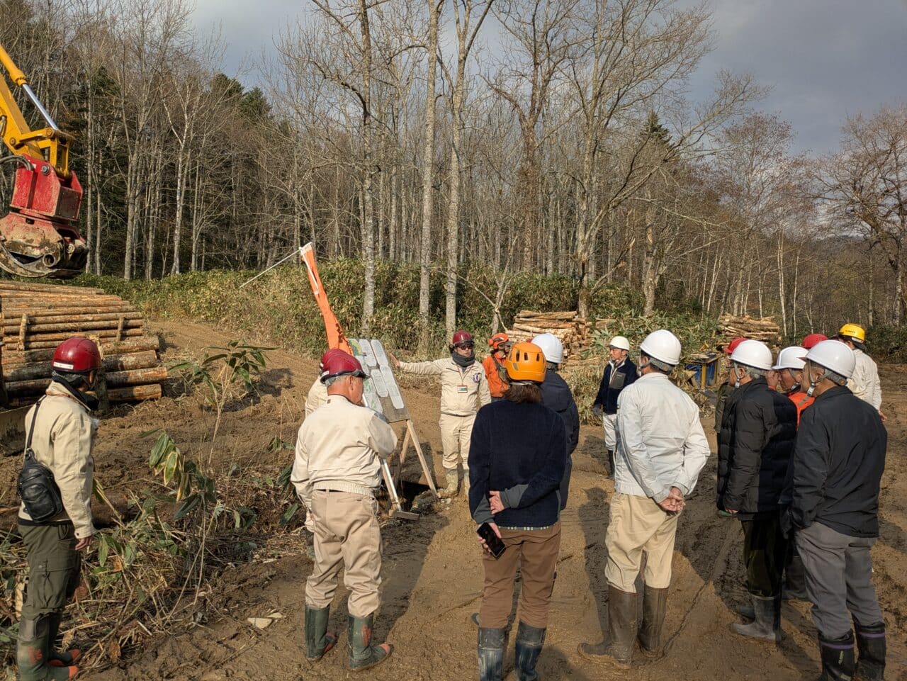 会場での意見交換後は、浜益地区の国有林において実施している間伐現場へ移動し、視察を行いました。現場では、直営による森林整備の状況や、安全対策、作業効率化の取り組みなどについて説明し、双方で意見を交わしました。